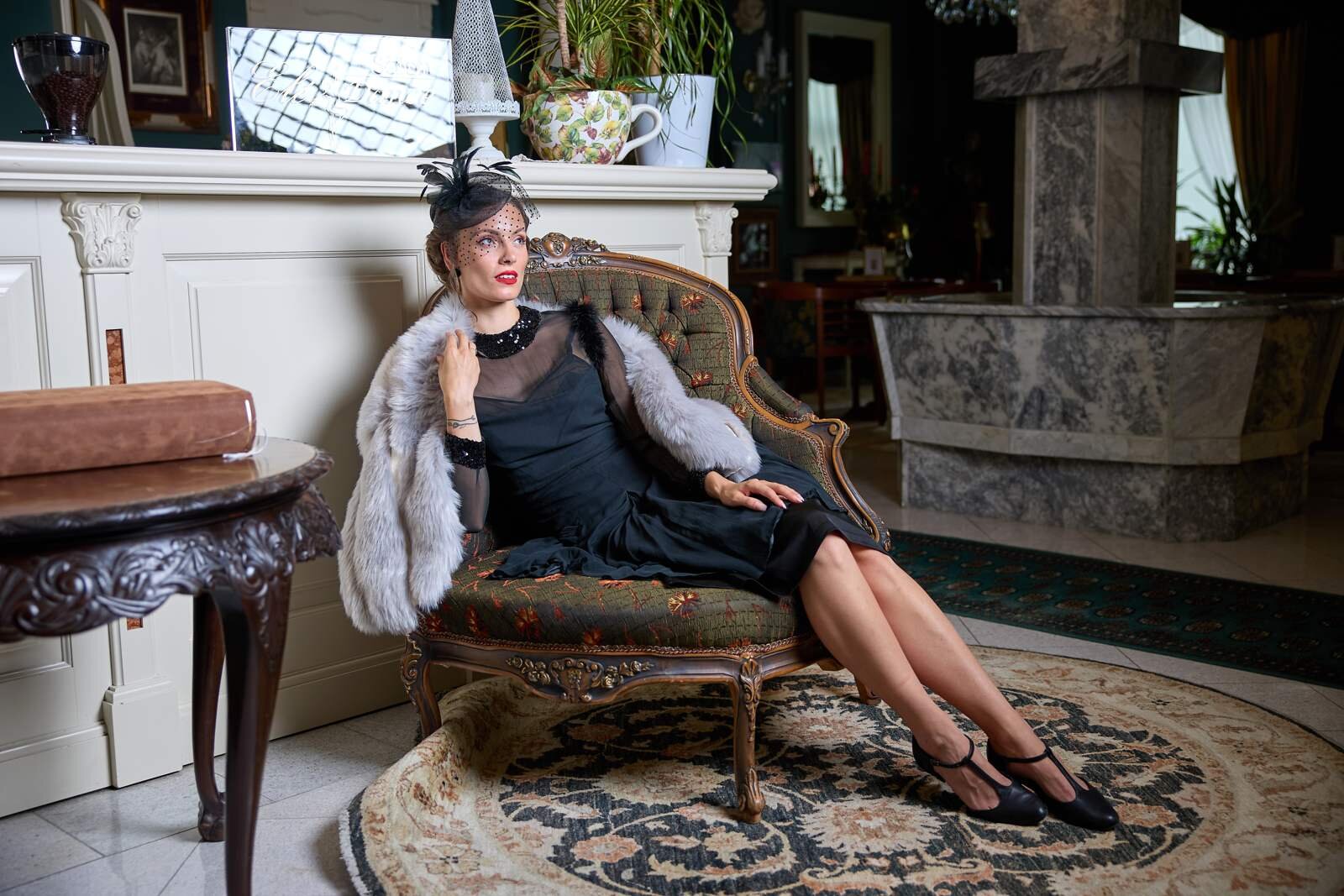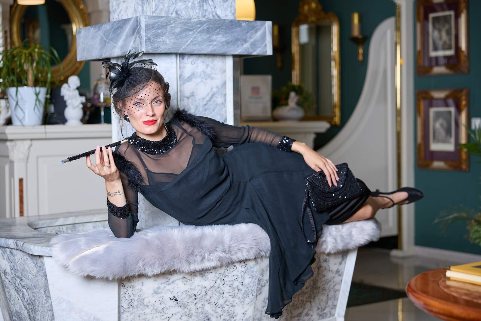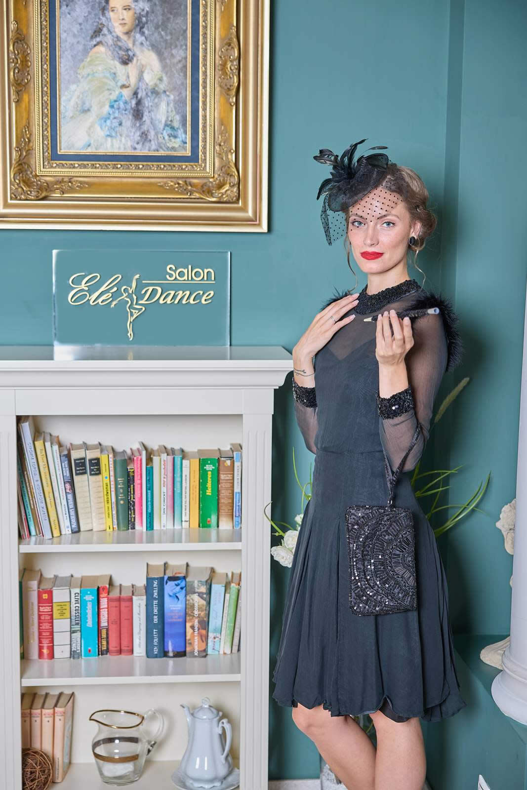 Luxus na hlavě v podobě černého fascinátoru dodá celému modelu nepřehlédnutelnost a šedá kožešina dojem luxusu.