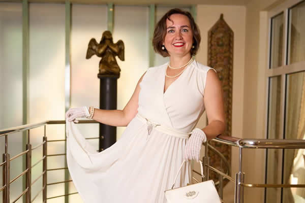Doplňky jsou decentní – perlové náušnice, náhrdelník a náramek, bílá kabelka či elegantní psaníčko a luxusní bílá kožešina.